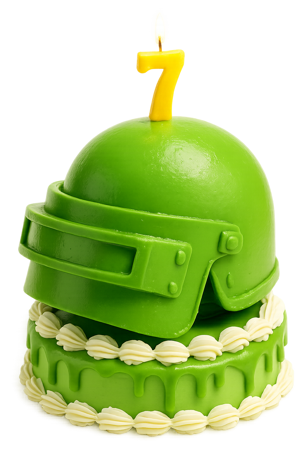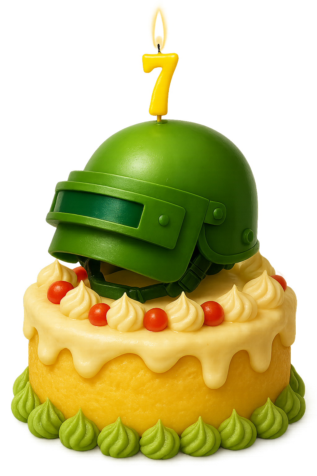 PUBGM 7주년을 기념하는 이 케이크에는 레벨 3 헬멧을 장식 요소로 디자인하고, ‘7’을 상징하는 촛불을 추가하여 PUBG만의 상징성과 유쾌한 감성을 담아냈습니다.