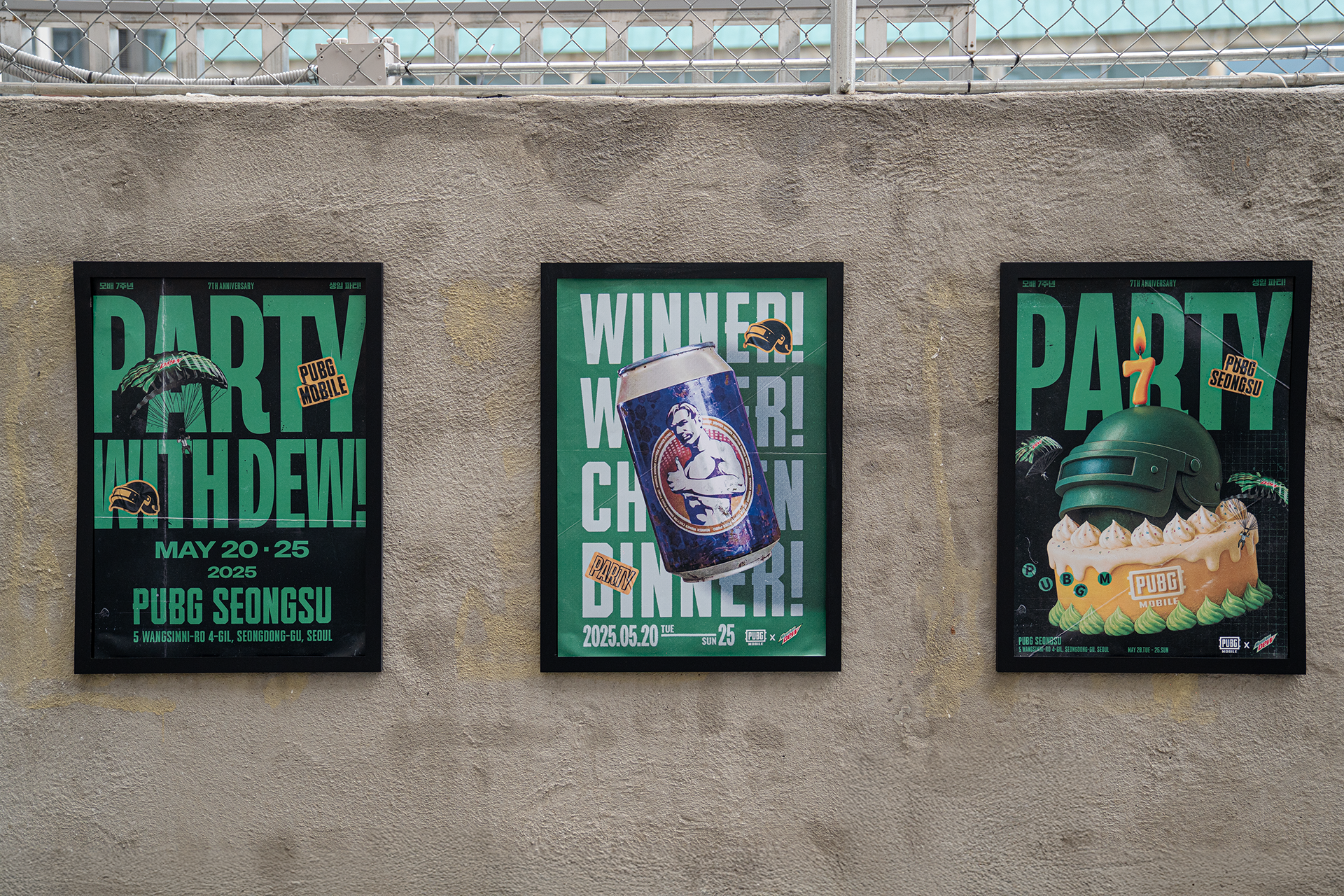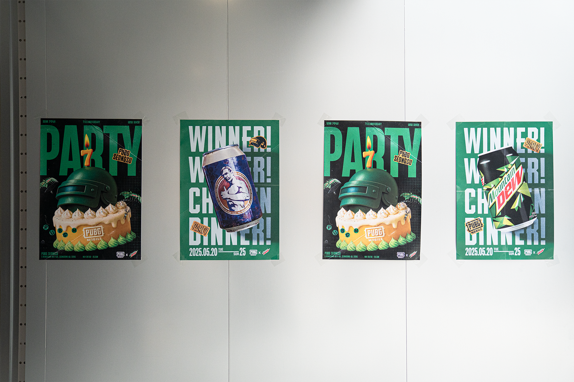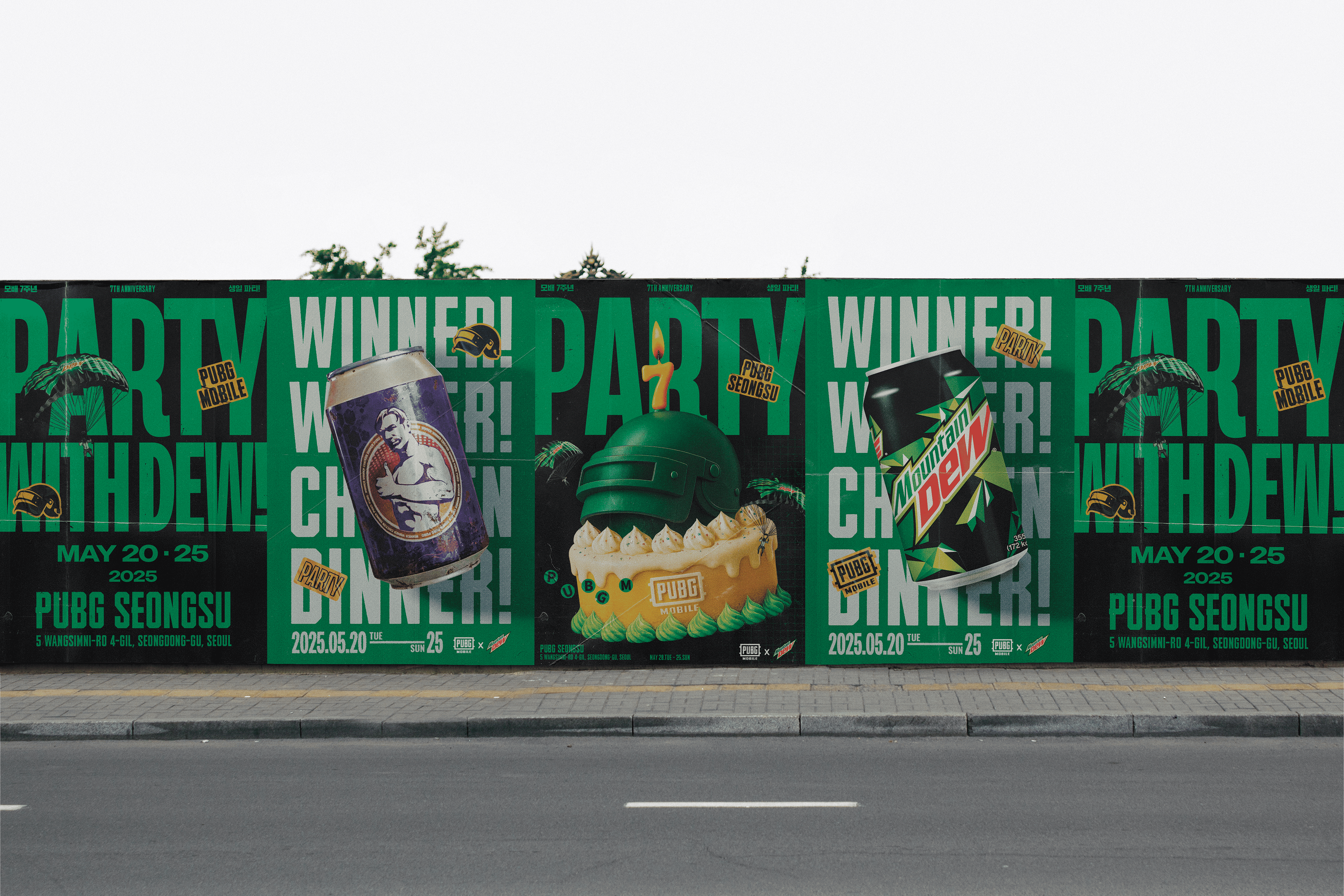 To celebrate the 7th anniversary of PUBG MOBILE, a special collaboration with Mountain Dew was launched as a pop-up event at PUBG SEONGSU. For this project, I created the key visual posters, delivering a package of four designs that served as the foundation for the entire event's visual identity. These posters were later adapted and expanded upon by another agency to complete the overall pop-up space design.
