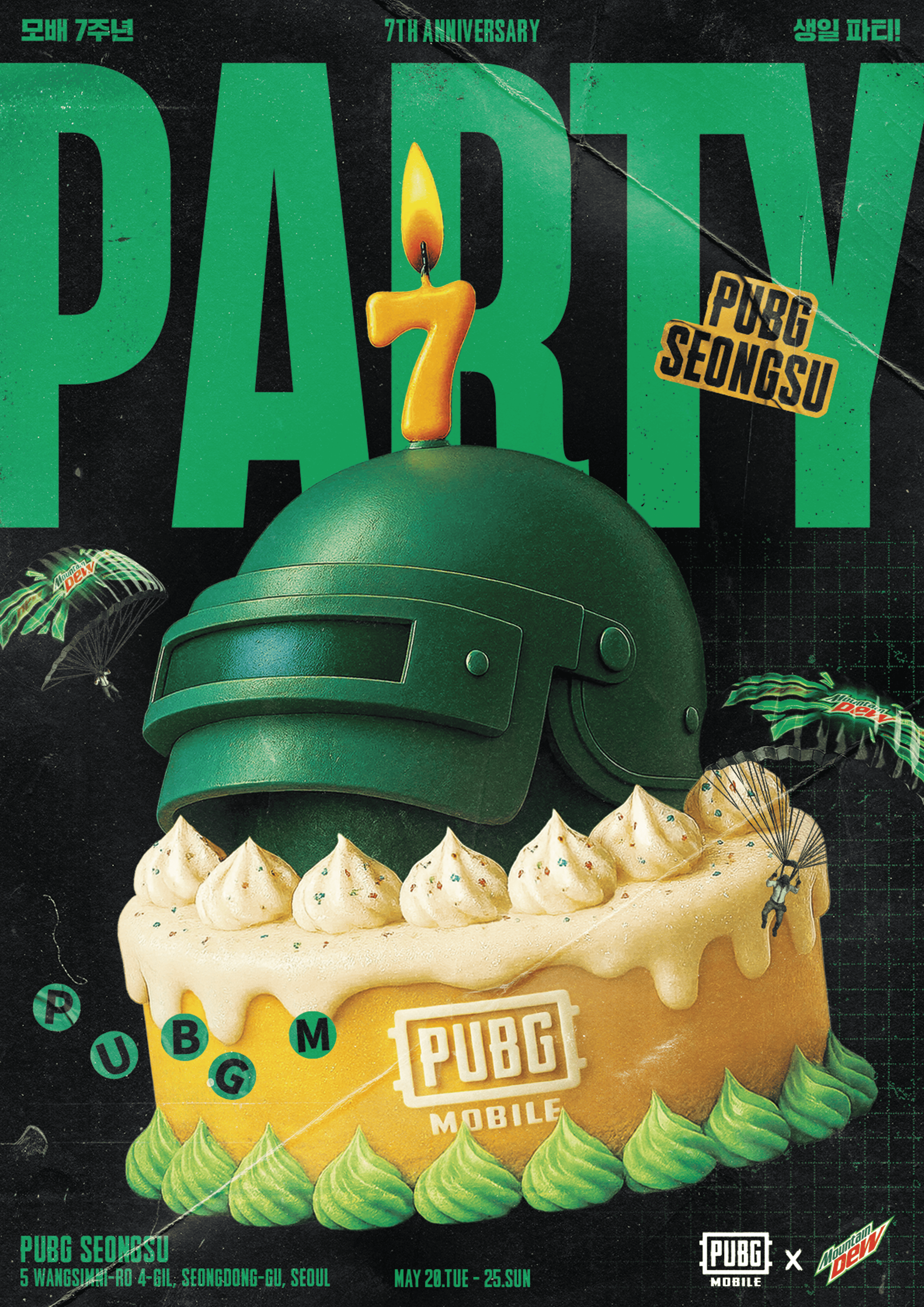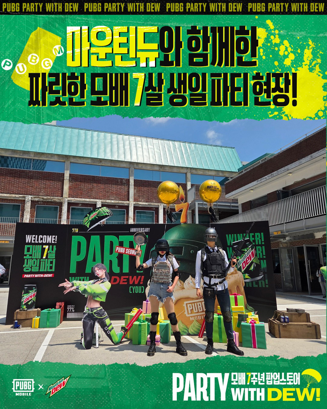 PUBG MOBILE의 7주년을 기념하며, Mountain Dew와의 콜라보 팝업 행사가 PUBG SEONGSU에서 진행되었습니다.