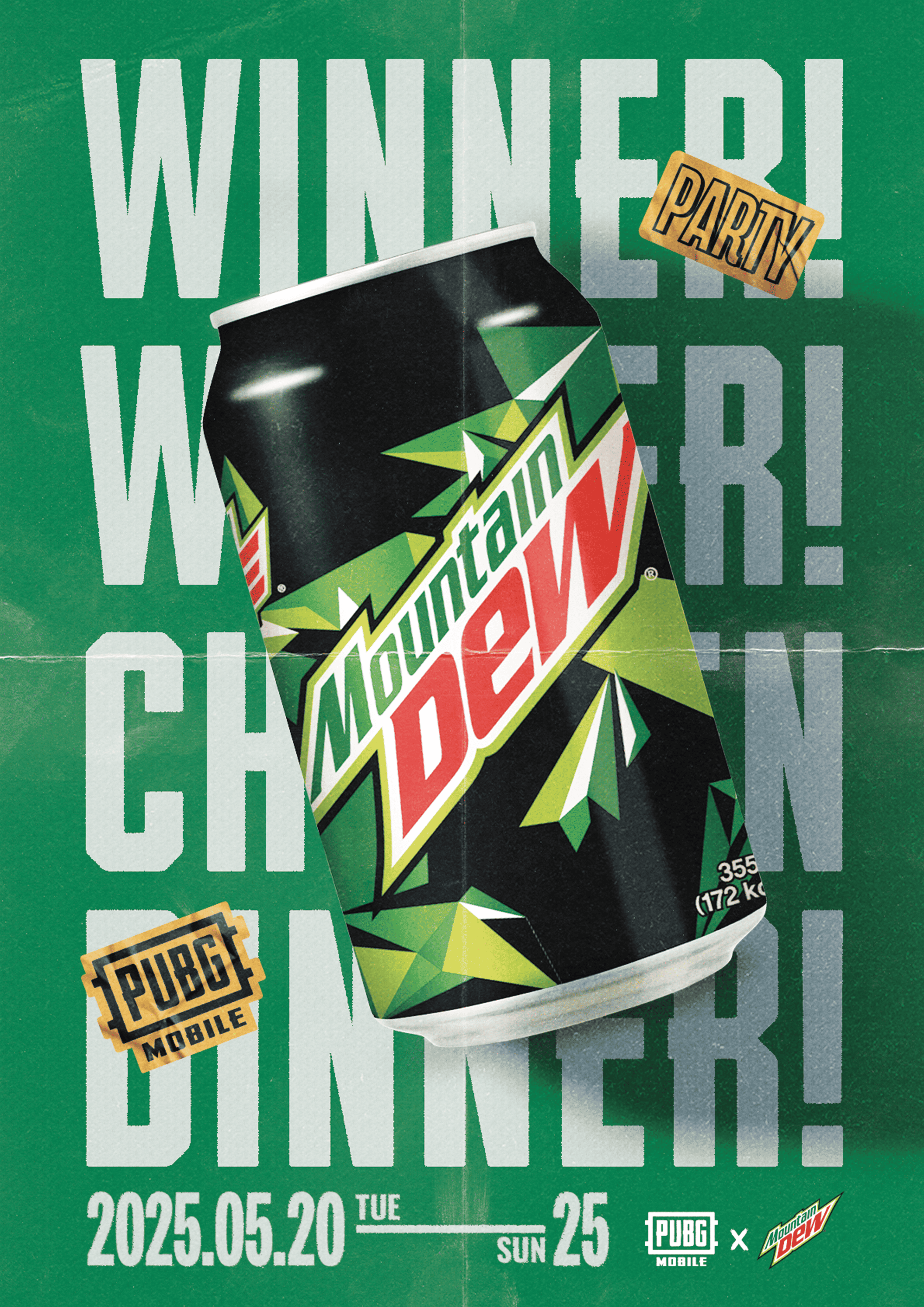 디자인 톤은 Mountain Dew의 선명한 그린 컬러와 PUBG의 강렬한 아이덴티티가 조화를 이루도록 방향을 설정하였고, 게임성과 브랜드 감성을 모두 담아내는 데 중점을 두었습니다.